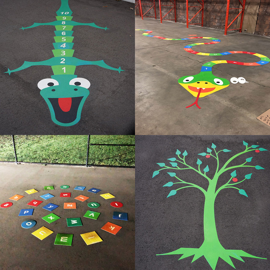 Our PlayScape line of preformed thermoplastic designs encourage learning and playtime. Choose from a variety of colorful and friendly designs which teach the A B C’s, counting, or literacy through sight words. Encourage problem solving with one of our mazes or trike trails. The possibilities are endless.